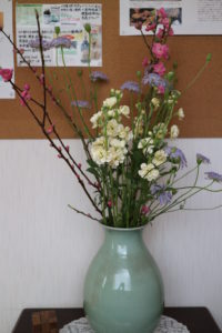 先週に続き、桃の節句が近いので、桃色の桃の花・薄紫色のブルーレース・クリーム色のストックで雛祭り気分です。